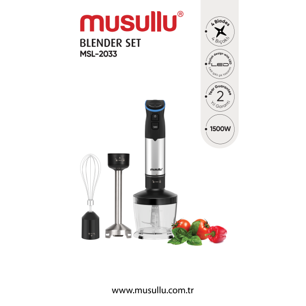 Mutfağınızda hız, güç ve çok yönlülüğü bir arada sunan Musullu Blender Set MSL-2033, günlük mutfak ihtiyaçlarınız için profesyonel çözümler sunar. 1500W yüksek motor gücü, ergonomik tasarımı ve zengin aparat seti sayesinde tek bir ürünle birçok işlemi zahmetsizce yapabilirsiniz.