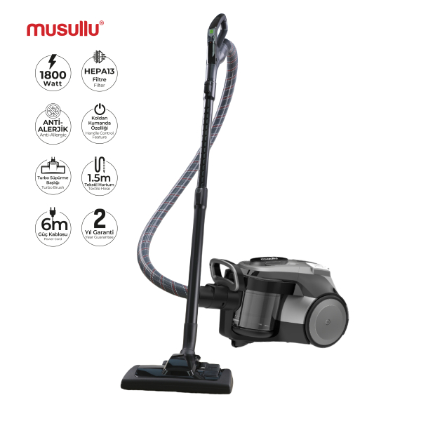 - Musullu Multi-Cyclone Elektrikli Süpürge, güçlü performansı ve pratik özellikleriyle temizlikte mükemmel bir yardımcıdır. 1800W gücüyle her türlü kir ve tozdan etkili bir şekilde arındırma sağlar. Koldan kumanda özelliği, temizlik sırasında rahatlıkla kontrol edebilmenize olanak tanırken, HEPA13 anti-alerjik filtresi sayesinde alerjik reaksiyonları minimuma indirir ve ortamı daha sağlıklı hale getirir.